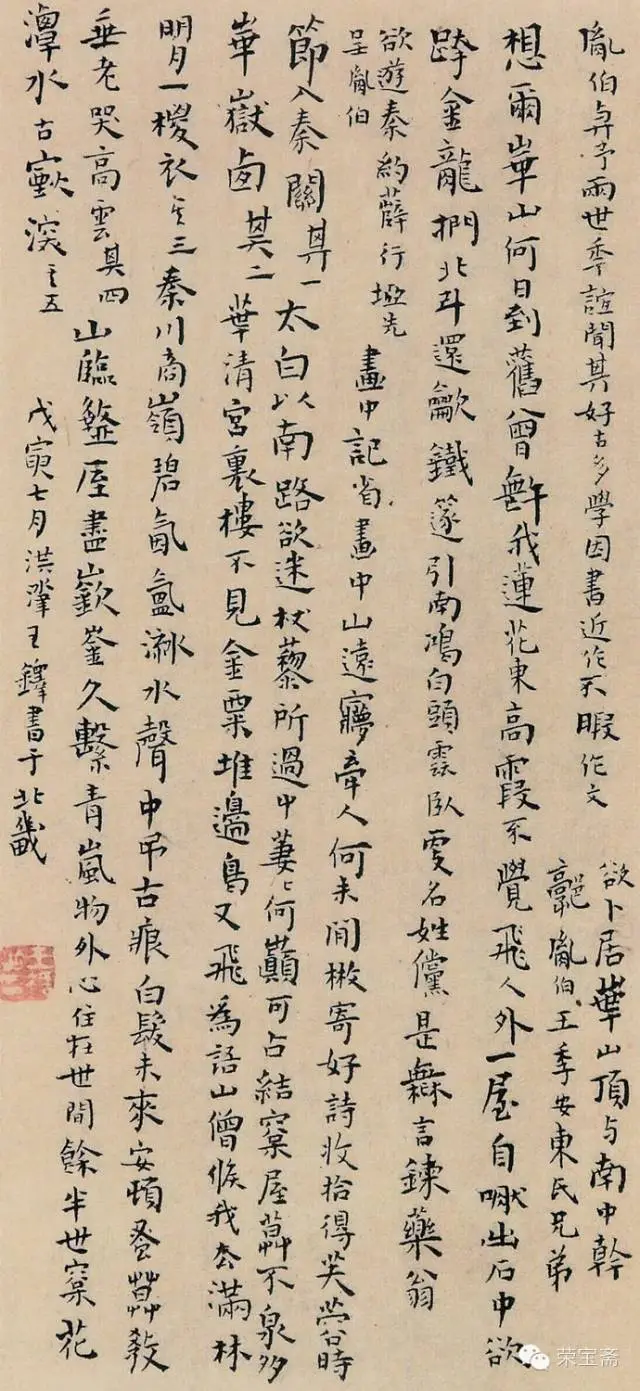 2. 复古与规范。中国文人对于古代典范的推崇是自古而来的文化传统,在书法方面则集中体现于对古老书体(如早已退出实用领域的篆、隶等)的学习。而明代尤为彰著地体现了“以篆为源”的观念,今人对此研究已甚多。从唐代张怀瓘在《书断》中所说“小篆古形犹存其半, 八分已减小篆之半,隶又减八分之半”来理解这一点也并不困难。另, 从文字演进的角度看,虽然八分制于隶书之后(认为东汉王次仲、蔡邕造者多持此论),但其创制显然是针对自秦代程邈以来“自下而上”所进行的文字简化的一次系统的规范和修整,清代刘熙载云:“由大篆而小篆,由小篆而隶,皆是浸趋简捷,独隶之于八分不然。萧子良谓‘王次仲饰隶为八分’,‘饰’字有整饬矜严之意。”虽然民间的书写简化是任何时代都存在的事实,但隶变过程中的谬误众多、改变六书造字原则也确有其事。因而通过增加字体中篆书的比例来规范字形,实际上就是恢复以“六书”为代表的古代文字构型及经典文化。这种文化心理与赵孟恢复魏晋笔法及明代“前七子”“后七子”的文学复古,具有相似的理论逻辑。