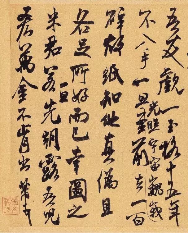 米芾“翰牍九帖”之一,此尺牍的书法风格,正是在追求以二王为代表的晋人书札作风。米芾名其居为“宝晋斋”,十分仰慕的正是晋人风流。他研习二王甚勤,尤其《蜀素帖》,后半部全从右军《兰亭》中来。但他最为倾心的是“破体”的小王,故《海岳名言》有谓:“子敬天真超越,岂父可比也。”落笔痛快,气势开张,英俊豪迈,更契合于米芾的性格。《丹阳帖》的写法就和献之笔札相近。但是,既经“重法”的唐代,提按已是普遍的笔法,兼之米芾个性强烈,字势愈加跌宕,用笔更形起落,牵丝显露,出锋锐利,真是“风樯阵马,沉著痛快”,大胆而泼辣,尺素之间亦使出了浑身解数.这与二王的散淡就有了距离.米芾毕竟还是米芾,米字到底还是米字,他能著名书史,开宗立派,不是没有缘由的。