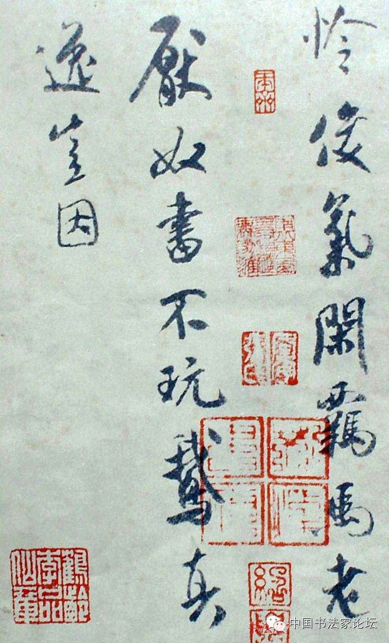 米芾[fú]的书法在宋四家中,列苏东坡和黄庭坚之后,蔡襄之前。然如果不论苏东坡一代文宗的地位和黄庭坚作为江西诗派的领袖的影响,但就书法一门艺术而言,米芾传统功力最为深厚,尤其是行书,实出二者之右。明代董其昌《画禅室随笔》谓:“吾尝评米字,以为宋朝第一,毕竟出于东坡之上。即米颠书自率更得之,晚年一变,有冰寒于水之奇。”明里自谦而实点到精要之处,“刷字”,体现他用笔迅疾而劲健,尽兴尽势尽力。他的书法作品,大至诗帖,小至尺牍、题跋都具有痛快淋漓,欹纵变幻,雄健清新的特点。从现存的近六十幅米芾的手迹来看,“刷”这一个字正将米字的神采活脱脱地表现出来,无怪乎苏东坡说:“米书超逸入神。”又说“海岳平生篆、隶、真、行、草书,风樯阵马。
