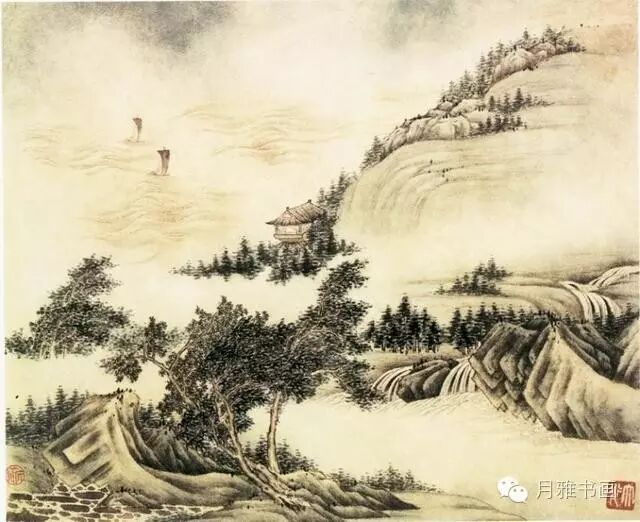 图三画山峦平冈,树木花繁叶茂,屋舍房宇掩映其间,溪水环山,波光粼粼,船上人物,形神动态俱足。图四写崇峦密岭,老树繁茂处,却有寺院深藏,小桥独亭,涧水汹流。笔法方硬兼圆润,景致工整又简练,独具一格。