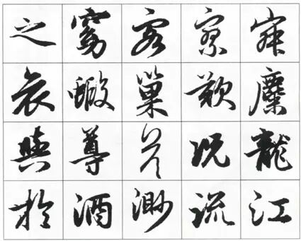此卷中的三点水较多,但写法上并不强求多变,而大多只是行笔间的细微差异。附图中“酒”、“渺”二字采用上断下连的写法,这也是最常见的处理,只有“流”、“江”、“海”等少烽字作了变化。