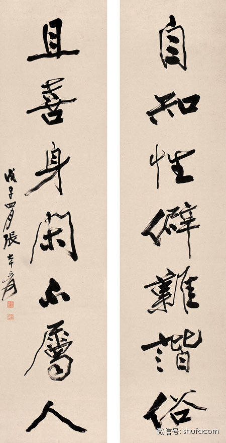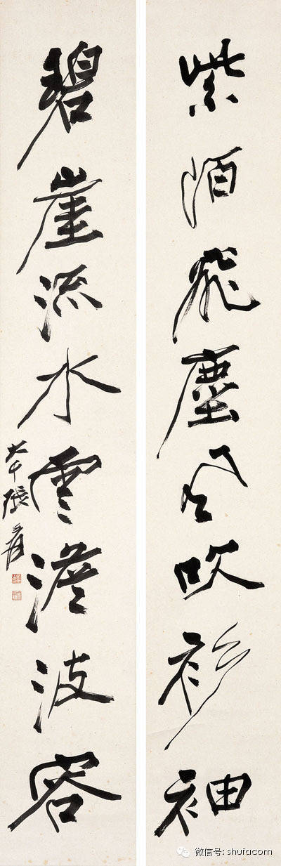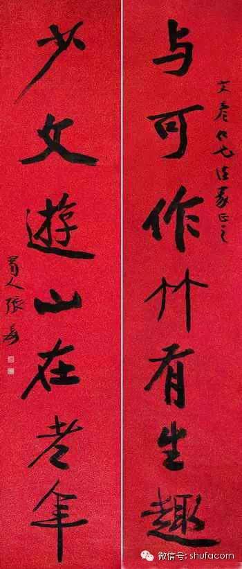 张大千兼擅书画,书法从学于清道人(李瑞清)与曾农髯,得力《瘗鹤铭》,参酌黄山谷体势,而自成一家。他本人虽然不创作联语,但却喜欢书写对联。据友人所记,他常写对联有以下几副: