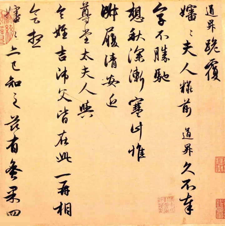 这是管道昇给婶婶的问安、馈赠的家信,实为赵孟頫所书。赵氏信笔写来一时忘情,末款署了自己的名,发觉后忙又改过,现在还可以看出涂改之迹。