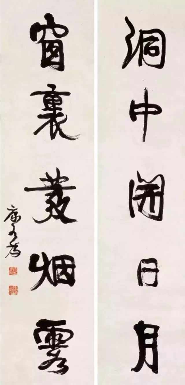 横画和直画在康书中被处理得较平直,但仍有为数不少这类笔画被他“做曲”,比如其横画多含隶意,略带弯曲度,部分竖笔也略呈或左或右的弓状。如《译字说诗联》、《读书闭门联》等作中的横笔、竖笔均或多或少隐含弯曲度,而非单纯的平直势(如前作之“中”、“国”、“字”、“小”、“禅”等字,后作之“书”、“随”、“闭门”等字)。