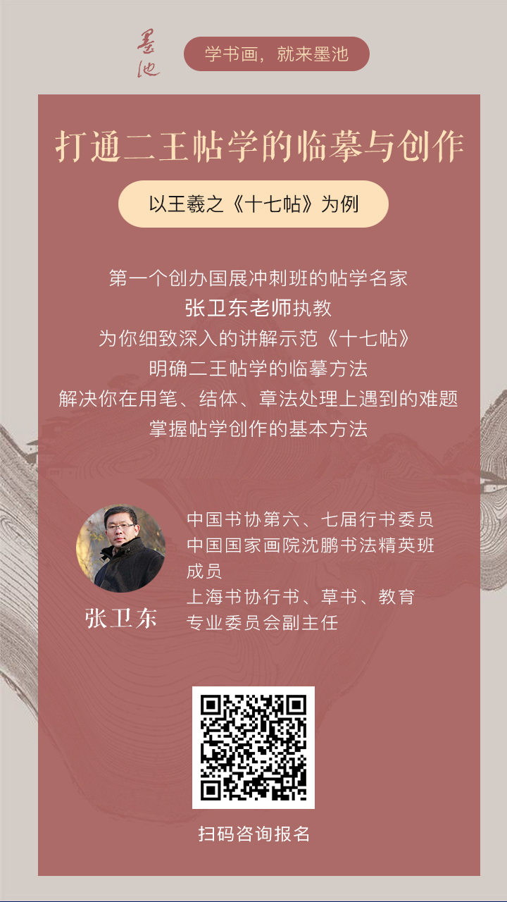 墨池学院特邀 中国书协第六,七届行书专业委员,持续参加国展22年、全国第一个创办国展冲刺班的帖学名家张卫东老师开设本次课程,以王羲之《十七帖》为例,通过三个课时细致深入的讲解示范,帮助广大学员明确二王帖学的临摹方法,解决在用笔、结体、章法处理上遇到的难题,通过对经典法帖的学习掌握帖学创作的基本方法。