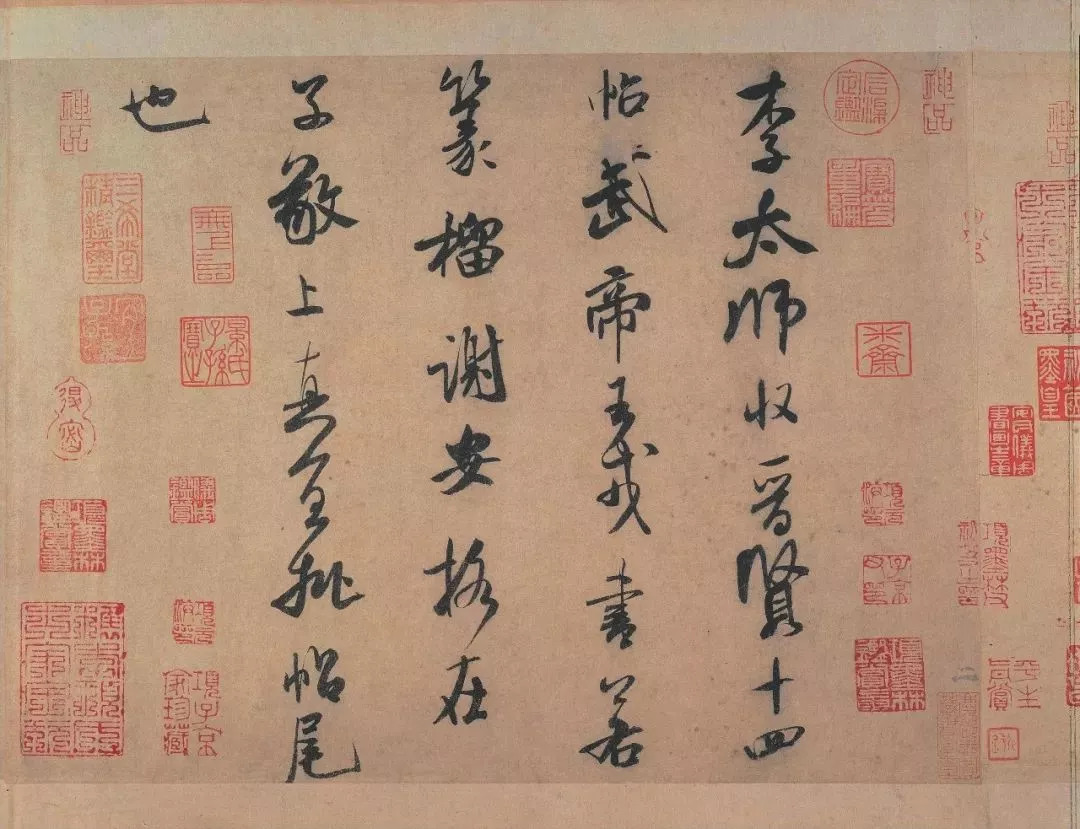 作为盛唐狂草的另一重镇,怀素在章法处理上较张旭更为狂放。从他的《自叙帖》来看,字形大小对比强烈,行内中轴线转折变化丰富,在行间形成了犬牙交错的内心追求的空白空间,笔势凌厉迅捷,神完气足。唐人称怀素草书有“骤雨旋风,奔设走虺”之势,信为不虚。