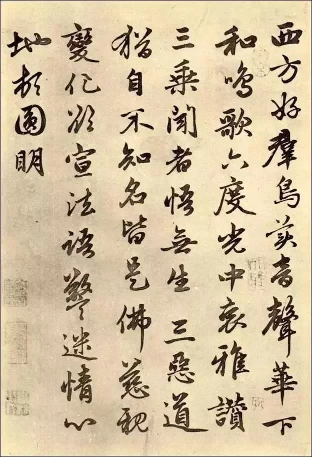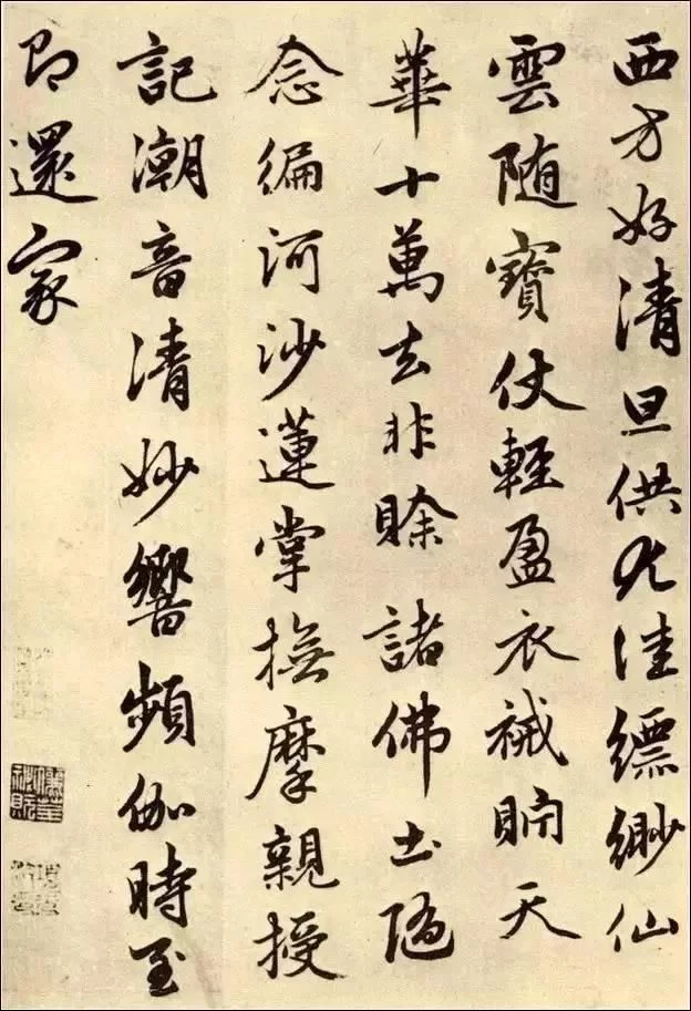 元朝赵孟頫 (1254-1322):字子昂,号松雪,松雪道,湖州(今浙江吴兴)人。他善篆、隶、真、行、草书,尤以楷、行书著称于世,《元史》本传讲,“孟頫篆籀分隶真行草无不冠绝古今,遂以书名天下”。元鲜于枢《困学斋集》称:“子昂篆,隶、真、行、颠草为当代第一,小楷又为子昂诸书第一。”其书风遒媚、秀逸,结体严整、笔法圆熟、世称“赵体”。其楷书圆润清秀,端正严谨,又不失行书之飘逸娟秀,世称“赵体”,代表作《玄妙观重修三门记》。