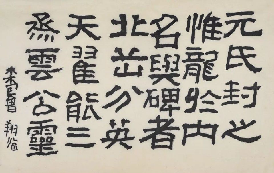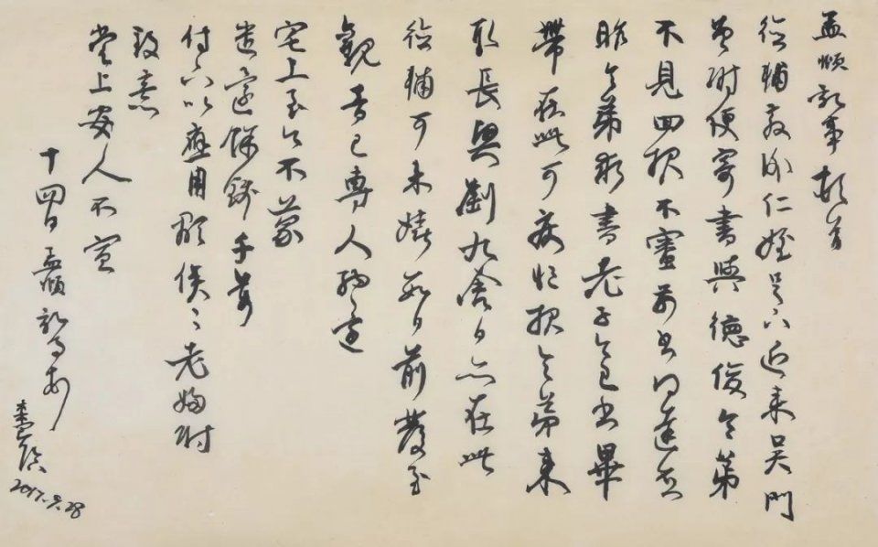 因此,我们可以把复杂的问题简单化到书写工具的性质和运笔、用墨方法上来。一个有经验的书者从长期的书法创作中,或许能找到一些答案,发现和掌握带有规律性的东西。比如用墨较浓、较渴,行笔速度较慢,用按笔、挫笔易产生涩劲的线条;蘸墨饱满,且墨较淡,多有渗、涨墨迹,易产生丰润的线条;用墨较浓,行笔多按,多中锋,墨色坚实,易产生朴厚、沉稳的线条;用墨浓、淡、枯、润适中,下笔沉着,用笔法度严谨,多产生工稳、刚健的线条;用墨适中,用笔参有偏、侧,行笔轻快多产生华滋、灵动的线条;放笔直书,不加修饰,不经意之中易产生稚拙的线条。至于柔韧、精到、稚拙的线条的产生除了用笔的原因之外,多是书者长期进行技法修炼和意识提升的结果。