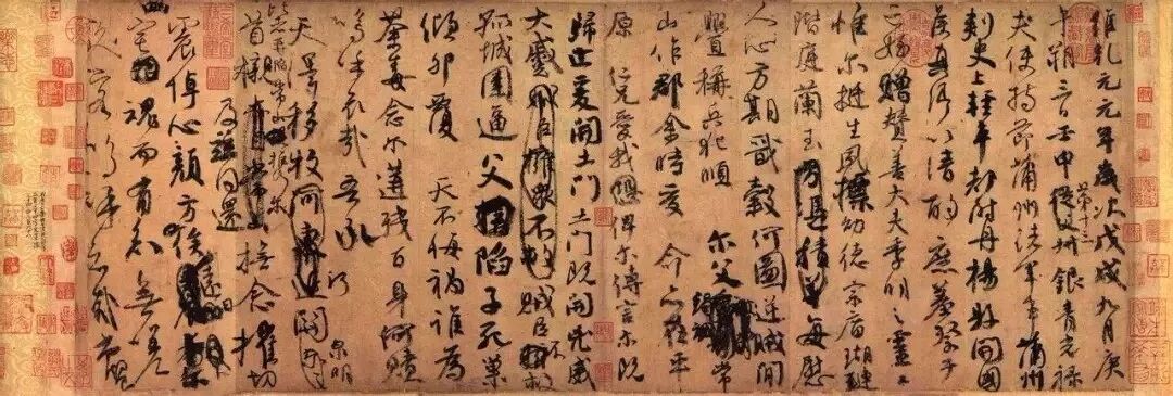 米芾的《翰牍九札》,是台北故宫博物院所藏的一卷米芾尺牍手札九纸的合成,曾刊于台湾《故宫历代法书全集》。每纸阔狭不一,笔法极为精熟,风格统一之中又极富变化,或茂密紧凑,匆匆不暇;或平稳安适,潇洒脱俗;或猛利骏快,巧趣横生。此九札自然天成,纵复涂抹增补之间亦精神饱满,气韵和谐。无怪乎苏东坡说:“米书超逸入神。”