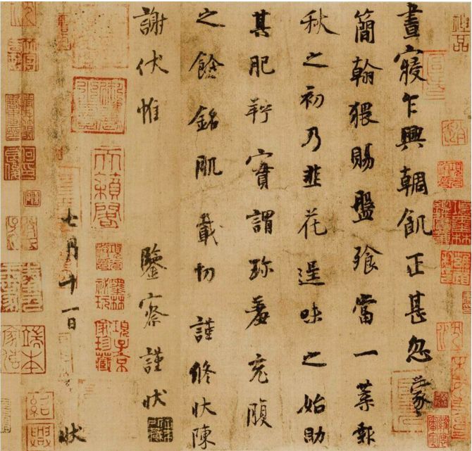约书于北宋哲宗绍圣四年(1097)十一月二十五日。纸上名家藏印累累。 因是信札,米芾写来十分随意,但扎实的功力使这件小札也体现了用笔迅疾、力沉奇倔,欹侧取势而无霸气,转折间多机巧锋芒,笔势放的开,收的住,可谓随心所欲而不逾矩。 李之仪评米芾:“超轶绝尖,不践陈迹,每出新意于法度之中,而绝出笔墨畦经之外,真一代之奇迹也。”