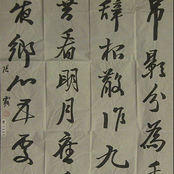1.作品要表现出通灵气质。“灵”的本义,虽然充满了浓郁的自然生命意识的巫史文化色彩,但从文字的起源上看,这种通灵气质是与生俱来的。历史相传黄帝的史官仓颉仰观天象移转变化,俯察鸟兽行留痕迹而创造了文字。从而破解了在蒙昧的原始社会里所谓神、鬼等对符号-形式的垄断(诸如祭祀、卜筮、图腾崇拜等等)。在人与鬼神之间,在人与自然之间,搭建普遍认识的桥梁。当然,我们不是有神论者,不能据此作为书法艺术作品要表现出通灵的气质的根据,但是文字的产生,的确是人类在认识自然、改造自然、利用自然的过程中,对结绳记事、刻画记事等记事方式的不断完善与改造而逐步形成的。而考古学科的不断深入与发展,更为详尽地印证了在文字产生的早期,笔画书写的痕迹是清晰可见的,和原始人类把贝壳当作装饰品一样,这种笔画的书写也是融和了原始人类朴素的审美情结的。所以,在一定意义上,书法就是伴随文字的产生而诞生的,文字是人类认识、改造自然的产物,是人与自然之间的一座桥梁,而书法艺术作品要表现出“灵”的自然天性就顺理成章了。